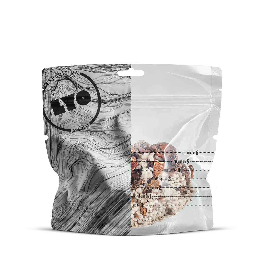 Porcini Risotto е лиофилизирано вегетарианско ястие с ориз, манатарки, Pecorino Romano и магданоз. Практично решение за планина, къмпинг, пътуване или аварийни запаси, което се приготвя бързо само с вряла вода.