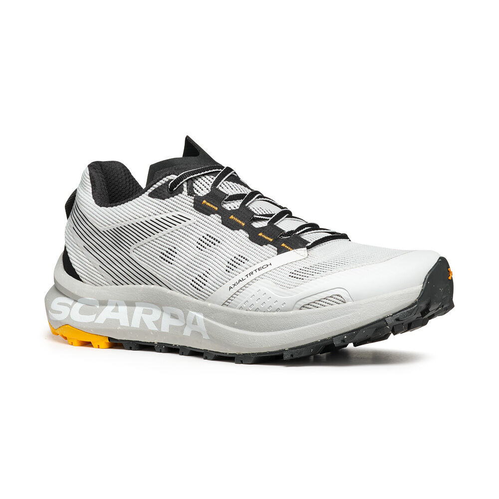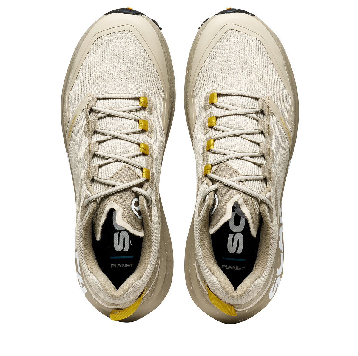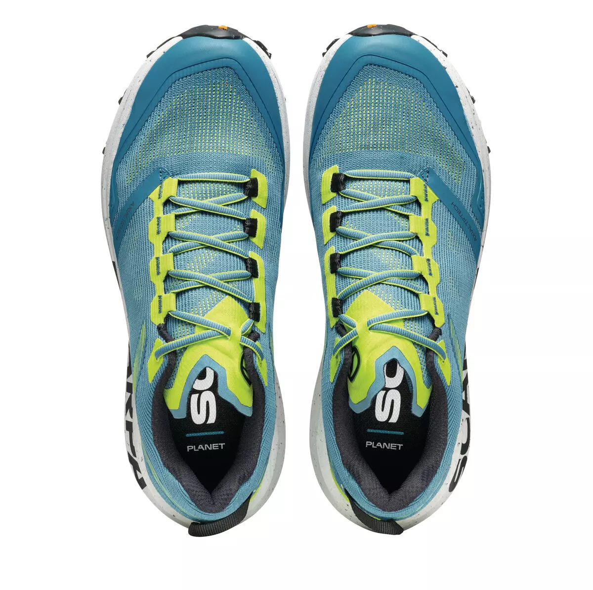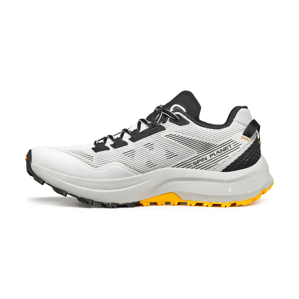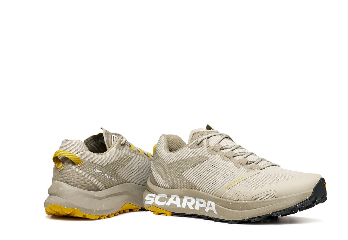 Следващата стъпка в пътуването на Scarpa за устойчиво развитие, SPIN PLANET въвежда нова концепция в категорията Trail Running с горната си част, която е изработена от 100% рециклирани материали, докато EVA междинната подметка е 45% рециклирана, а гумената външна подметка е 30% рециклирана. Идеалните обувки за бегачи, които преследват дълги разстояния по трейл пътеките, благодарение на обема на междинната подметка, предназначен да абсорбира ударите със земята и да осигури защитно омекотяване.