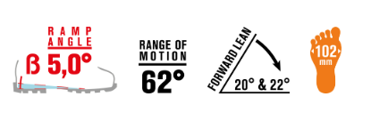 Обувката разполага с лост ski/walk, който позволява плавен и бърз преход между режим на изкачване и режим на спускане. Конструкцията на черупката осигурява стабилност и прецизно предаване на енергията при завои, а здравите материали гарантират устойчивост в сурови алпийски условия.